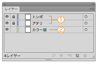 テクニカルガイドDMファイルデータの作成方法 レイヤーについて ①トンボ・アタリレイヤー 印刷に必要なトンボと、仕上がりの抜きの目安になるアタリのレイヤーです。このレイヤーは一切の変更を禁止しています。ロックを解除しないでください。(誤作業防止のため、初期状態ではロックがかけてあります。) ②カラー版レイヤー 絵柄のデザインはこのレイヤーに行ってください。このレイヤー内のものはすべて印刷されます。アタリやメモ書き等を入れないでください。 illustratorのチェックポイント 一覧 トンボと塗り足しについて 塗り足しについて カラーモードについて レイヤーについて 配置画像について 文字のアウトライン化について 線・塗りの設定について オーバープリント(スミノセ)について スミベタ・リッチブラックについて 保存について